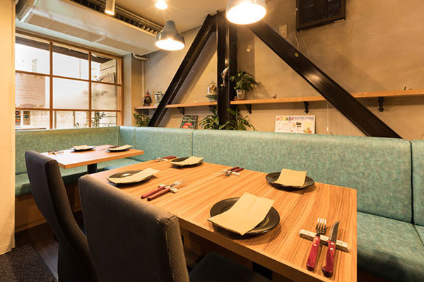 耐震対策用に当初から入っていた鉄骨ブレース(補強材)だが、うまく店のデザインとマッチし、隠れ家のような落ち着く空気を与えてくれている。イメージカラーのひとつ、碧(あお)を取り入れたソファーがとても爽やか。椅子のみの席構成だった前店舗と違い、ゆっくり寛げる雰囲気が生まれている。