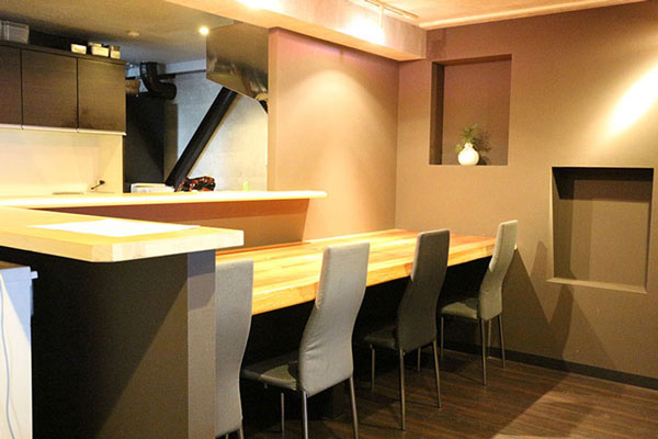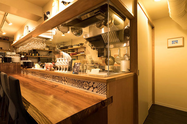 厨房・カウンター部分を大改造して「見せられる厨房」に。にわかには以前の内装が想像できない程のイメージチェンジを果たしている。厨房設備は総入れ替えして、オープンキッチンに転換。地中海調の白とネイビーの美しいタイルが目を引く。譲渡された立派な一枚板のカウンターは、半分に切断して現店舗でも引きつづき使用している。