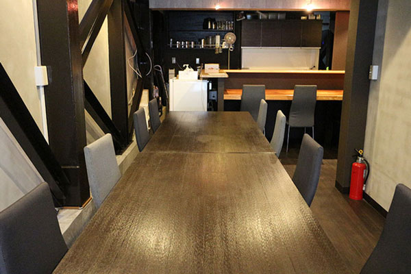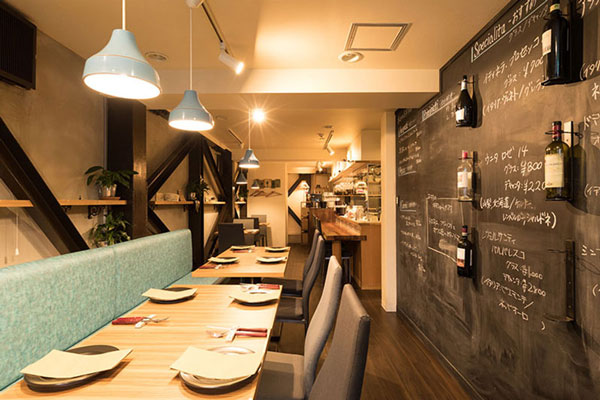 入口から入ってすぐの風景。右手の壁は全面ブラックボードを張り、自慢のワイン・日本酒を説明書きとともに飾っている。天井、壁、テーブルなど、随所にアイボリーやナチュラルウッドの明るいカラーを配置。そのことで、これまでにないあか抜け感と暖かみが生まれているのが分かるだろう。