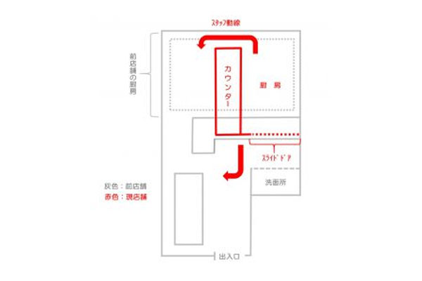 住宅地での地域密着型レストランを構想して選んだのは、高級住宅地もすぐ隣の世田谷・池ノ上。元家庭料理居酒屋の居抜き店舗を大幅にリフォームし、現代感と素朴な暖かみが同居したハイセンスなお店をつくりあげた。洗練された内外装はデザイナー会社に依頼。店名「アオゾラ」を想像させる青・白・ブラウンのテーマカラーをまず設定して、そこからデザイン案を膨らませていったという。吉野さんが最もこだわったのは厨房。下図のように既存のカウンター・調理スペースを大胆につくりかえ、美麗な店舗デザインの一部となるような魅力的なオープンキッチンに変身させた。自ら3D ソフトを使って図を引き、ワン・オペレーションにも耐えうる効率的な動線も実現。機敏なサービスに向けて、厨房から客席への出入口は奥側と玄関側の2 箇所に設けた。洗面所に入る客と目線が合って気まずい思いをさせぬよう、玄関側はスライドドアにするという細やかな配慮も。前店舗には家庭用冷蔵庫3 台しか入っていなかったため、本格的な調理に向けて厨房設備は総入れ替えした。