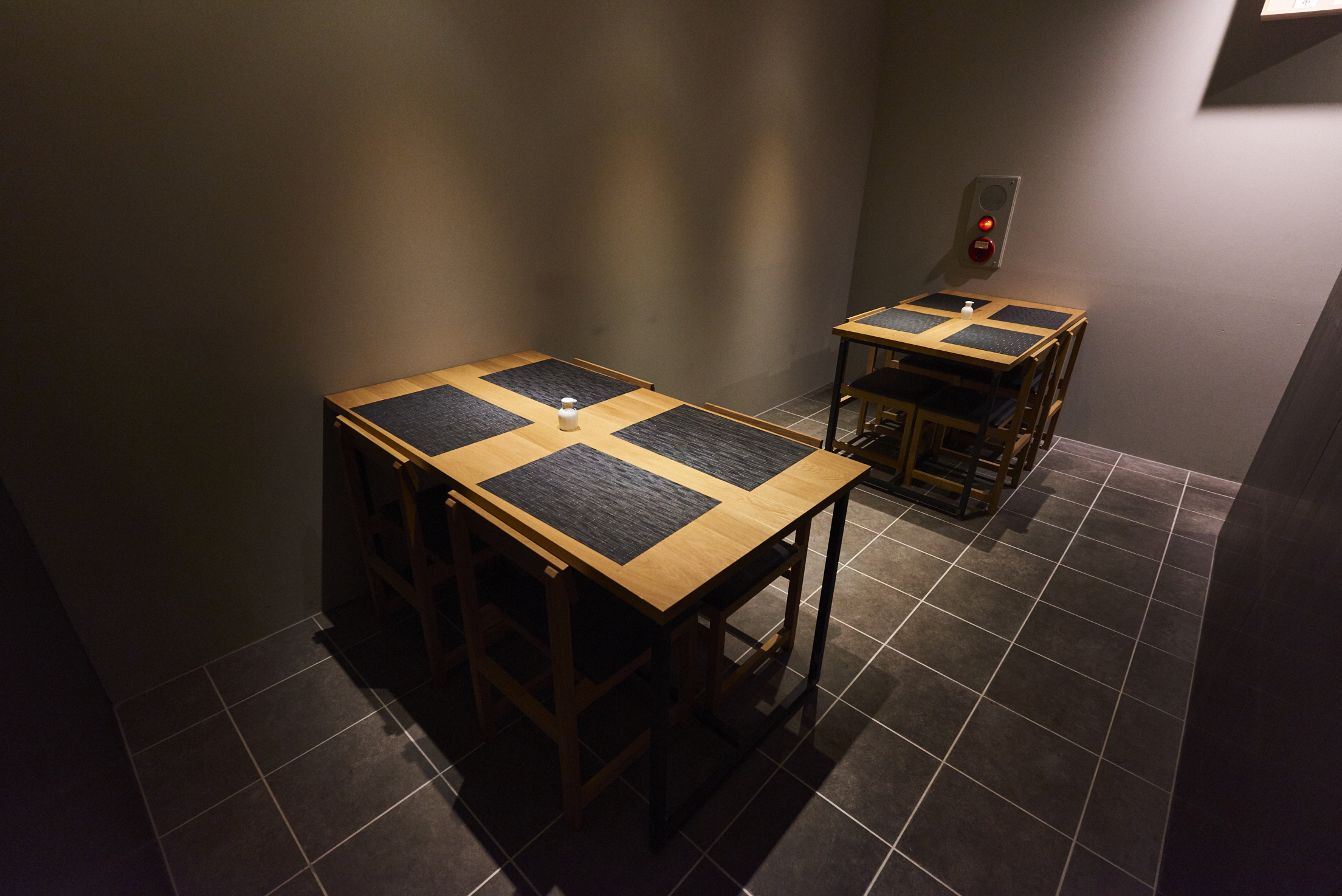 建物の構造上そのスペースに面影を残す店舗奥のテーブル席部分。直線で構成されていながら温かみを感じる空間に。