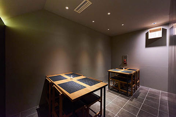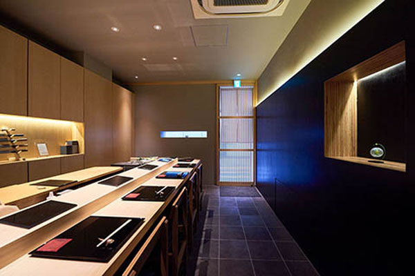 シンプルな薄茶色の暖簾をくぐると、高い天井が印象的だ。長くしつらえた美しいカウンターは特別製の一枚板で、新店舗への心意気が感じられる。明暗のコントラストがついた落ち着いた空間は、席の間も充分に取られ決して緊張を強いることはない。正方形を多用した直線で構成された店内にも関わらず、印象は柔らかく居心地のよさを感じられる。