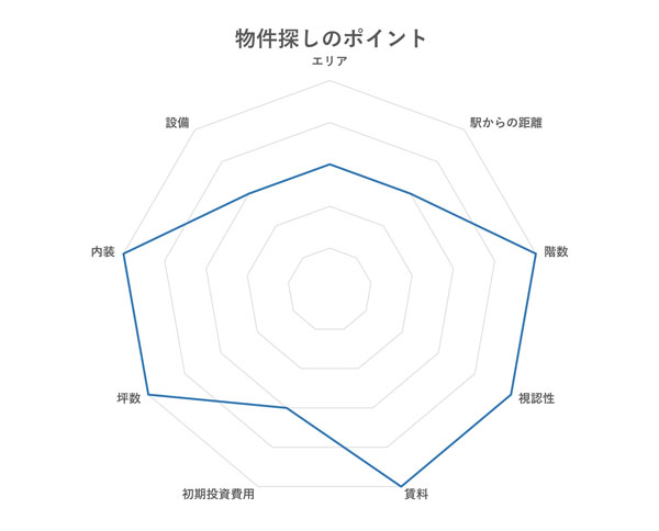 「1階路面店」「相場と比較した際の賃料の安さ」といった要件や、”落ち着いたエリアのこぢんまりとした店舗が良いな”というイメージはありつつも、その他に関するこだわりは特段なく、これまで数多くの店舗を手掛けてきたからこそ分かるビジネスの成否を瞬時に掴んで物件を目利きされていました。
